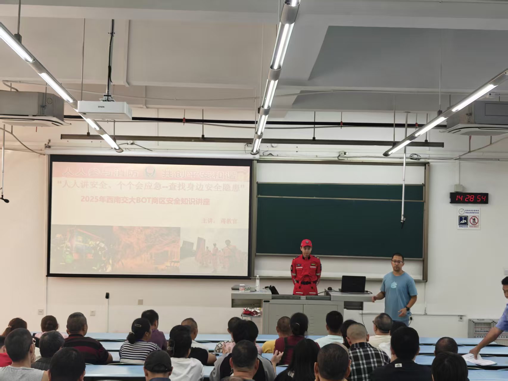 为了进一步提升BOT商区商户的消防安全防范应急意识,10月14日下午,我校邀请四川防隅安全技术有限公司的蒋教官,为犀浦校区BOT商区的全体商户及管理人员举办了一场以“人人讲安全、个个会应急——查找身边安全隐患”为主题的消防安全知识讲座。
