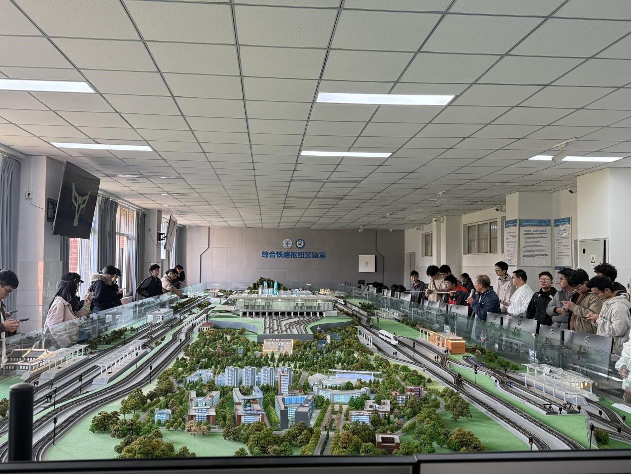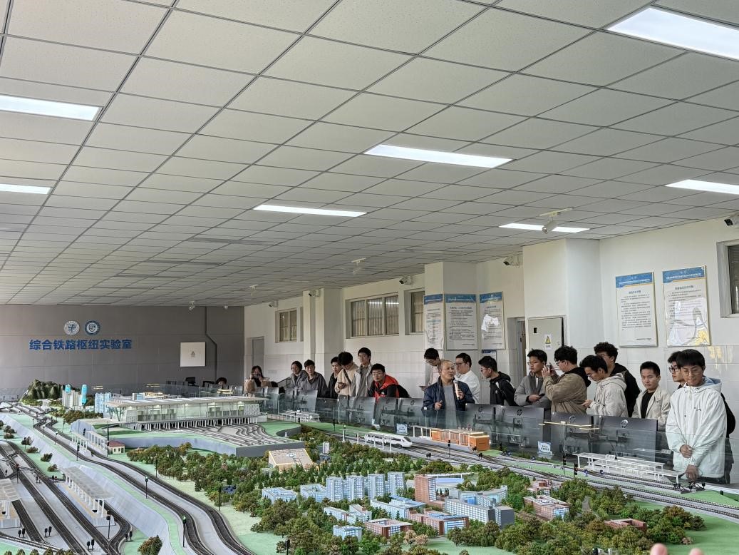 运输模型实验室:面对铁路道岔、机车、动车组、转向架等齐全的模型,老师结合实物细致讲解设备的基本组成与工作原理。“每一个模型都精准复刻了真实设备的核心结构,大家可以触摸观察,感受铁路装备的精密设计。” 同学们围在模型旁,认真记录、积极提问,现场学习氛围浓厚。