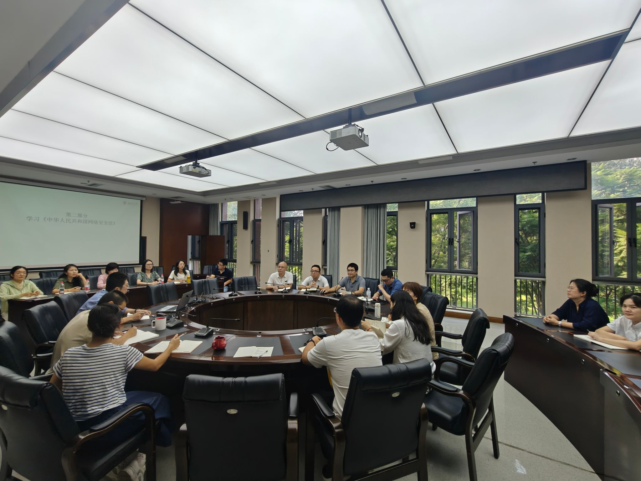 第二部分,会议集中学习了《中华人民共和国网络安全法》,重点解读网络空间主权、网络安全等级保护、个人信息保护、法律责任等关键条款。邓永权书记强调,全体同志要增强网络安全意识,严格遵守法律法规,落实管理责任,切实保障学校网络与信息安全,维护国家网络安全。